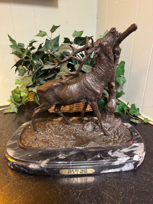Bronze & Marble Statue "Elk By Tree" By: P.J. MENE