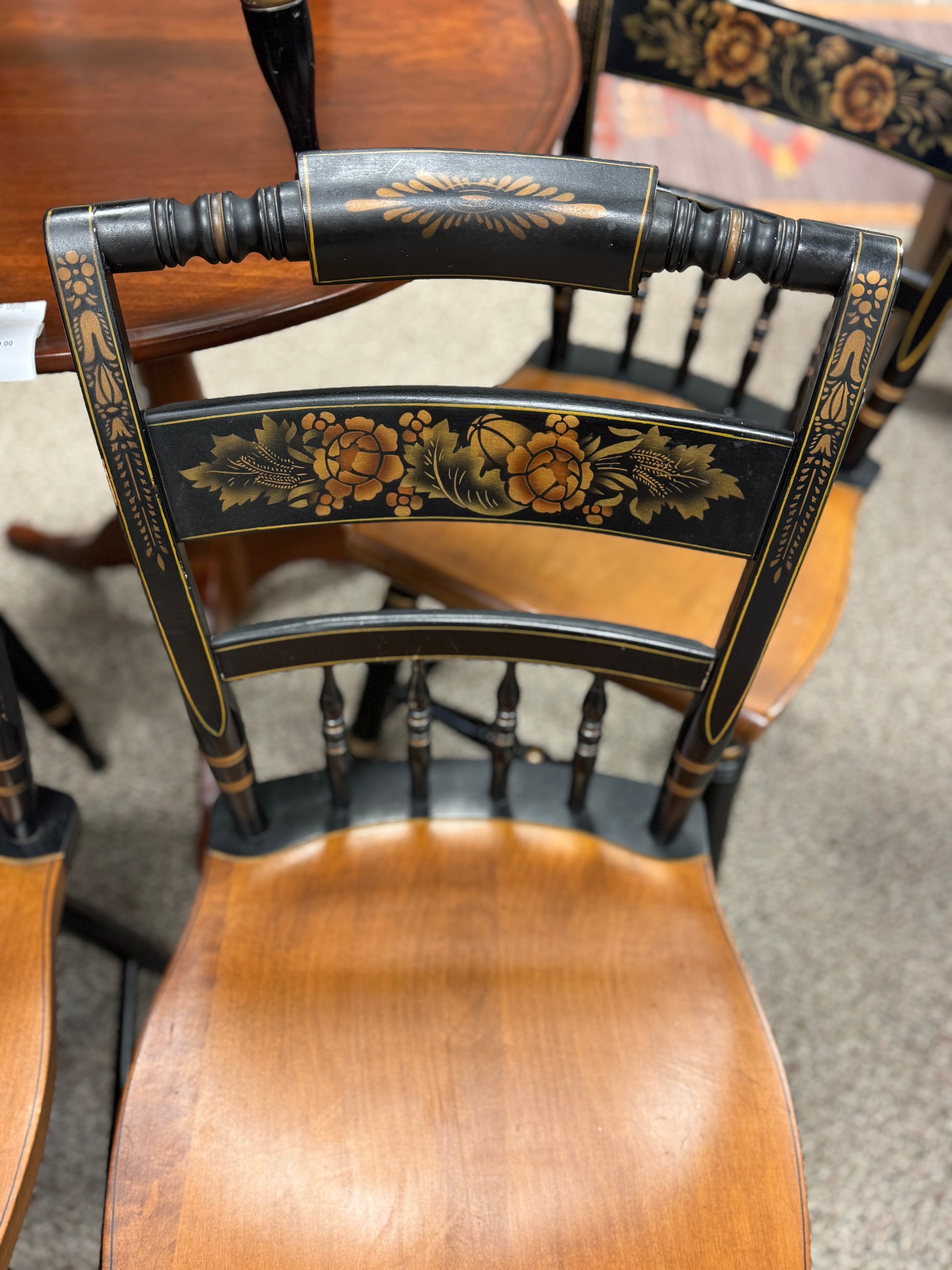 This chair is in good vintage condition, displaying light wear consistent with age and gentle use. Some minor scuffs to the black paint and gold detailing are visible, particularly on the lower legs, enhancing its authentic patina. The stenciled artwork remains vivid and intact, and the seat retains a smooth finish with natural grain visible.